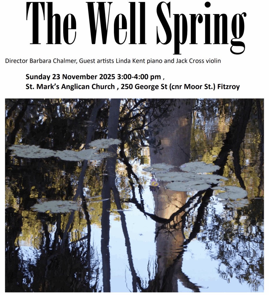 Be it delight at the lofty shimmering of a rainbow, a deep feeling of connection to new life springing from the land, or a humble recognition of our own small place in creation, Nature has served as inspiration for mankind from earliest times. Cantabile’s concert, The Well Spring, is a garden of songs rooted in this spiritual soil. With pianist Linda Kent and violinist Jack Cross we hope to bring a feeling of freshness and renewal as we move into the holiday season.